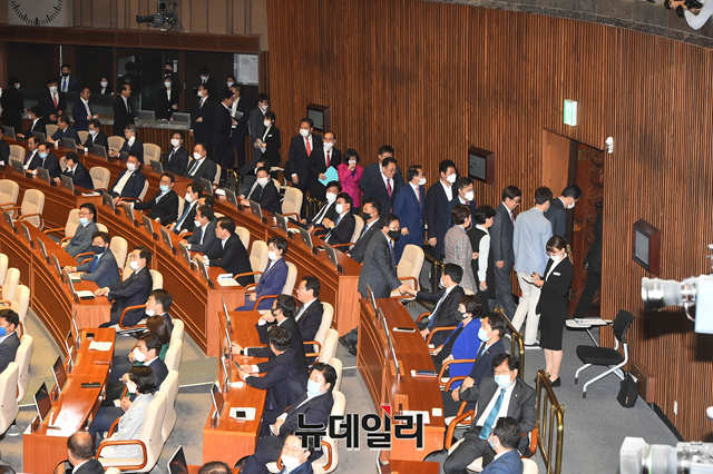 21대 국회가 개원한 5일 오전 국회 본회의장에서 미래통합당 의원들이 주호영 원내대표의 뒤를 따라 퇴장하고 있다.