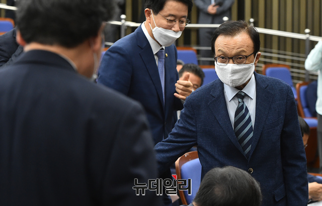 이해찬 더불어민주당 대표가 8일 오전 국회에서 열린 의원총회에서 참석해 이낙연 의원을 바라보고 있다.