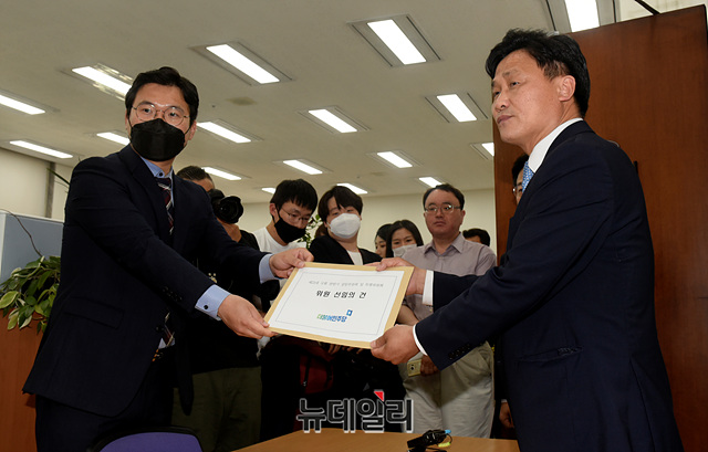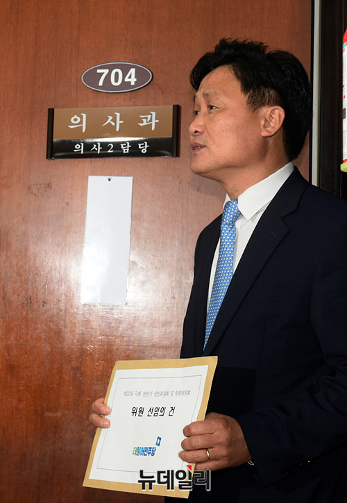 김영진 더불어민주당 원내총괄수석부대표가 8일 오전 국회 의사과에서 제21대 국회 전반기 상임위원회 및 특별위원회 위원 선임안을 제출하고 있다.