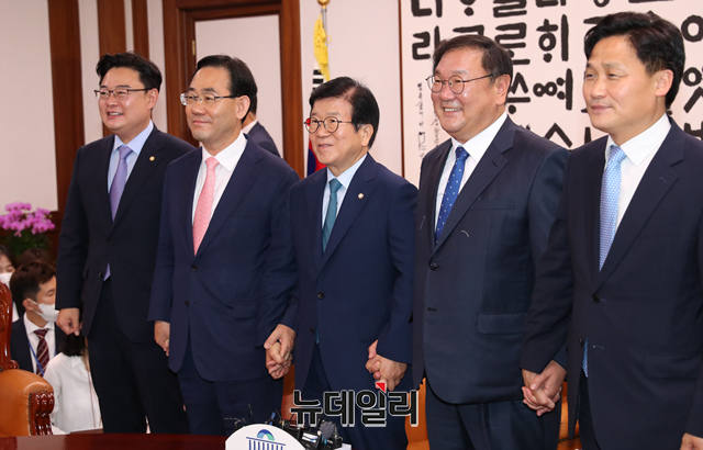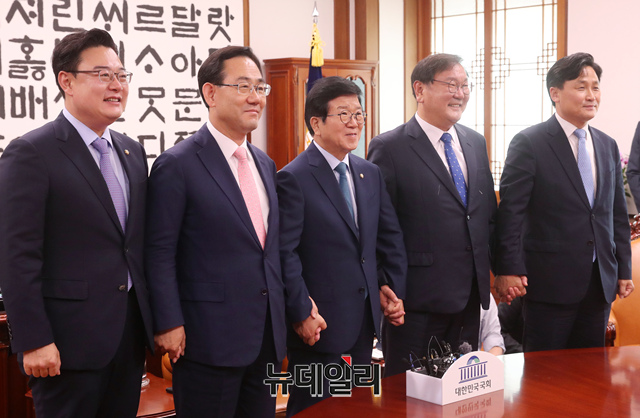 [포토] '국회 원구성 협상'을 위해 만난 국회의장과 여야 원내대표