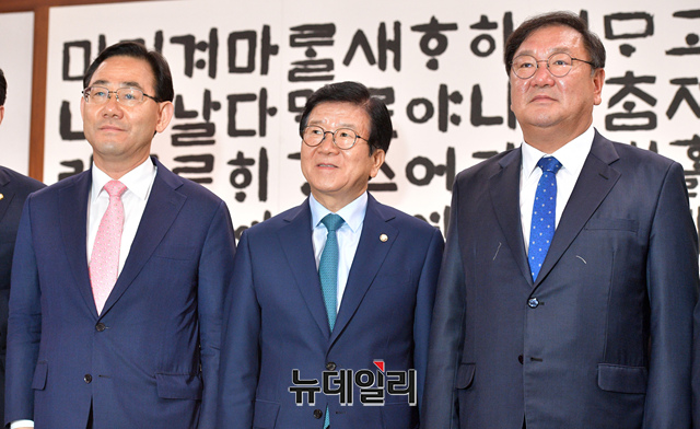 박병석 국회의장이 8일 오후 국회 의장실에서 '국회 원구성 협상'을 위해 김태년 더불어민주당 원내대표와 주호영 미래통합당 원내대표을 위해 만나 기념사진을 촬영하고 있다.
