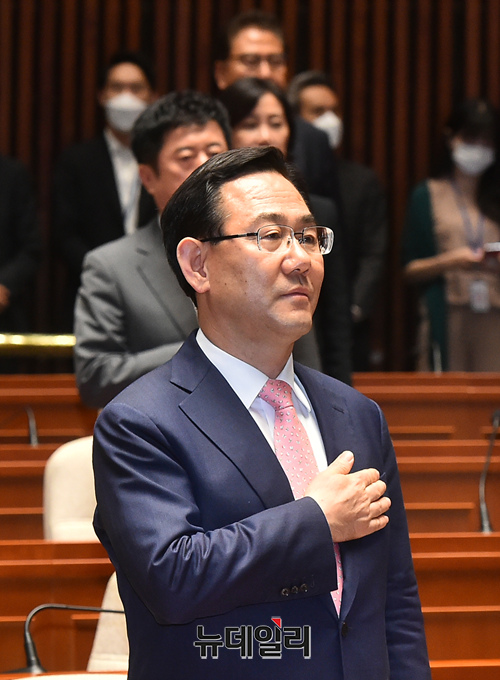 [포토] 국민의례하는 주호영 미래통합당 원내대표
