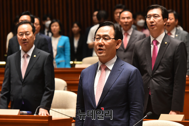 주호영 미래통합당 원내대표와 소속의원들이 8일 오후 국회 예결위회의장에서 열린 의원총회에 참석해 국민의례를 하고 있다.