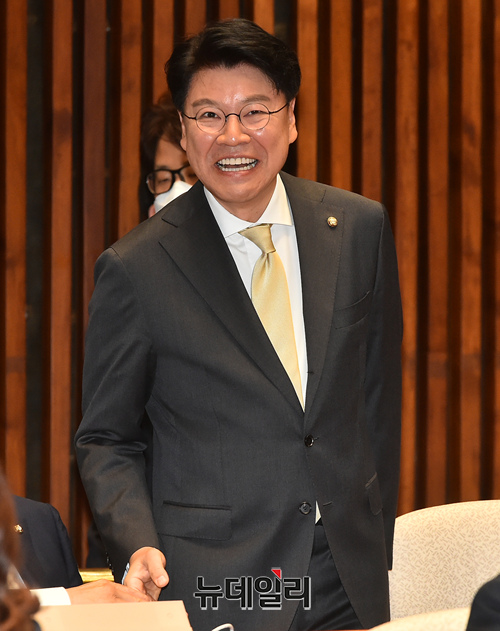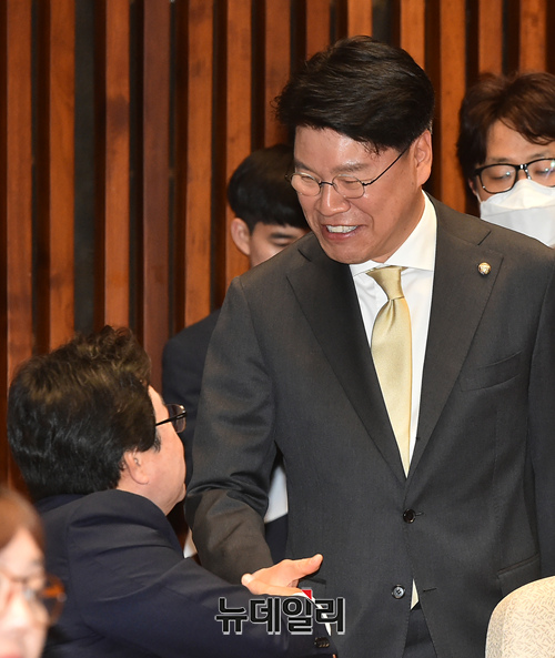 장제원 미래통합당 의원이 8일 오후 국회 예결위회의장에서 열린 의원총회에 참석해 동료의원들과 인사를 나누고 있다.