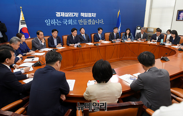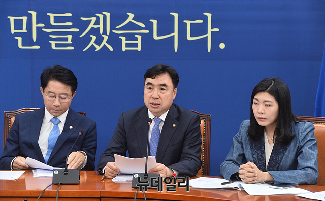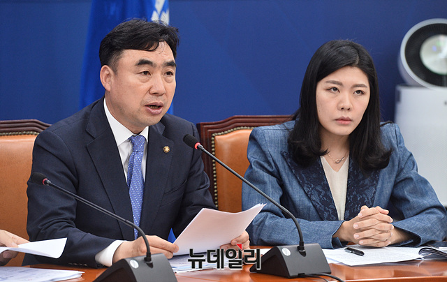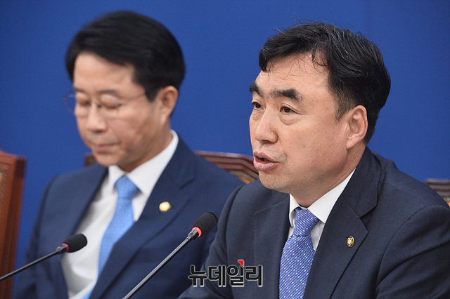 윤관석 더불어민주당 정책위수석부의장이 9일 오전 국회에서 열린 원내대책회의에서 모두발언을 하고 있다.