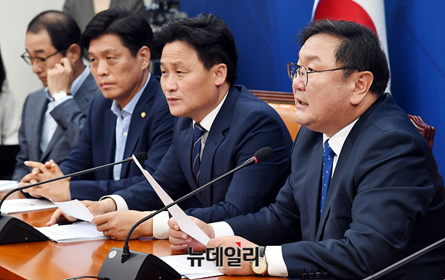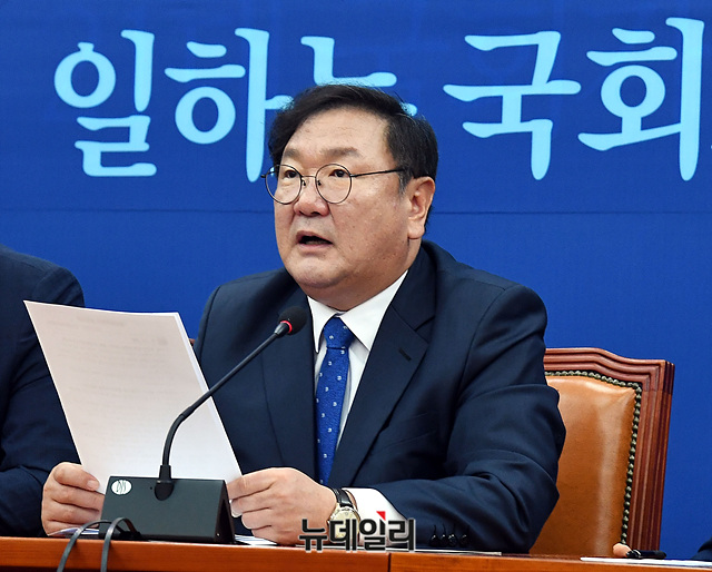 김태년 더불어민주당 원내대표가 9일 오전 국회에서 열린 원내대책회의에서 모두발언을 하고 있다.