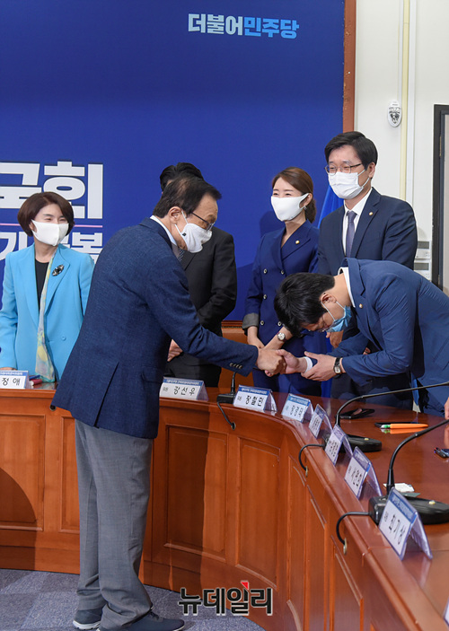 [포토] 민주당 전준위 위원들과 악수하는 이해찬