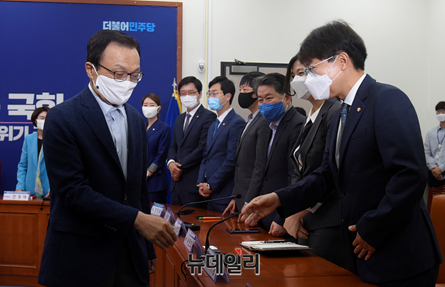 이해찬 더불어민주당 대표가 9일 오전 국회에서 열린 '더불어민주당 전국대의원대회 준비위원회 제1차 회의'에서 위원들을 찾아가 악수를 나누고 있다.