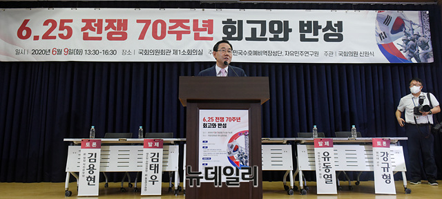 주호영 미래통합당 원내대표가 9일 오후 국회 의원회관에서 열린 6.25전쟁 70주년 회고와 반성 정책세미나에서 축사를 하고 있다.