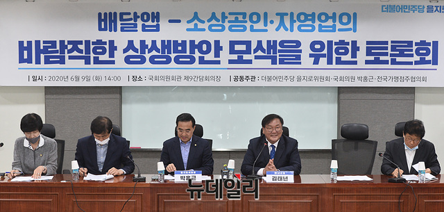 김태년 더불어민주당 원내대표가 9일 오후 국회 의원회관에서 열린 '더불어민주당 을지로위원회 배달앱-소상공인·자영업의 바람직한 상생방안 모색을 위한 토론회'에서 인사말을 하고 있다.