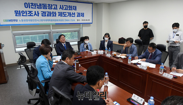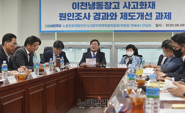 김태년 더불어민주당 원내대표가 9일 오후 국회 의원회관에서 열린 '이천냉동창고 사고화재 원인조사 경과와 제도개선 과제 간담회'에서 인사말을 하고 있다.