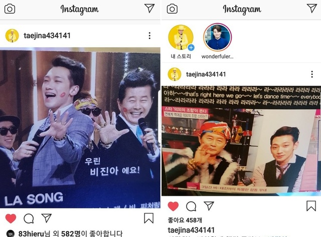 태진아는 지난 7일 공식 SNS에 "사랑하는 비와 함께 했던 콜라보 #비진아", "여러분, 비 사랑해주세요"라는 글과 함께 두 장의 사진을 게재했다.