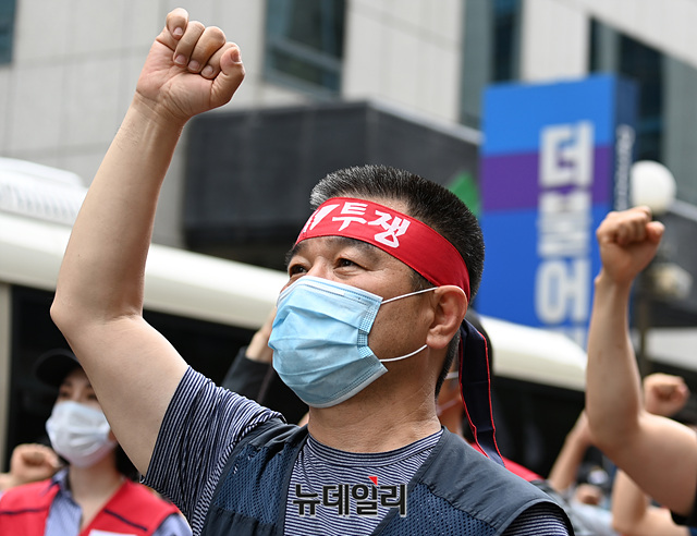 민노총 산하 공공운수노조가 10일 오후 서울 여의도 더불어민주당 당사 앞에서 열린 '공항 항공노종자 정리해고 구조조정 분쇄 공공운수노조 결의대회'에 참석해 팔뚝질을 하고 있다.
