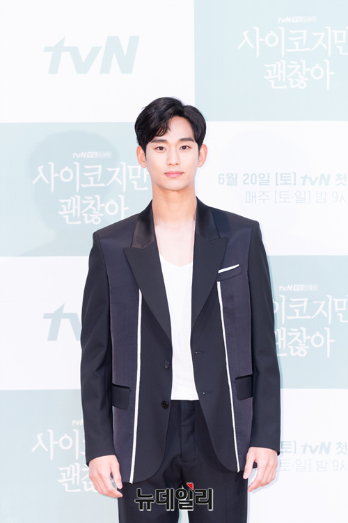 배우 김수현이 10일 오후 온라인으로 열린 tvN 새 토일드라마 '사이코지만 괜찮아(극본 조용, 연출 박신우)' 제작보고회에서 포토타임을 갖고 있다.