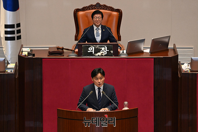 김영진 더불어민주당 의원이 10일 오후 국회 본회의장에서 열린 제379회 국회(임시회) 제3차 본회의에서 국회상임위원회 위원 정수 관련 일부개정규칙안에 대해 제안설명을 하고 있다.