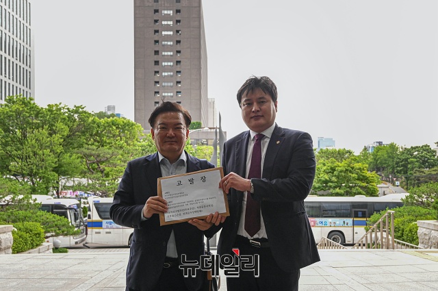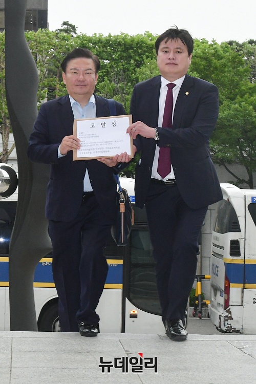 민경욱 전 의원과 박주현 변호사가 10일 오후 서울 서초구 대검찰청에 중앙선관위 상임위원과 소속 직원과 윤경준 한틀시스템 대표를 공직선거법위반, 허위공문서작성, 공용물건손상죄 등 혐의로 고발하기 위해 방문했다.이들은 "무효표 등을 1번 표에 가게 하거나, 투표지 수와는 관계 없이 2번표 등을 감소시키는 방법으로 투표를 증감했고, 국민의 세금으로 구매한 노트북 부품을 임의로 탈거한 행위는 형법상 공용물건손상죄에 해당한다"며 고발 이유를 밝혔다.