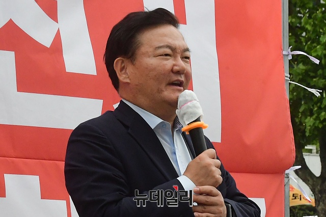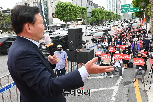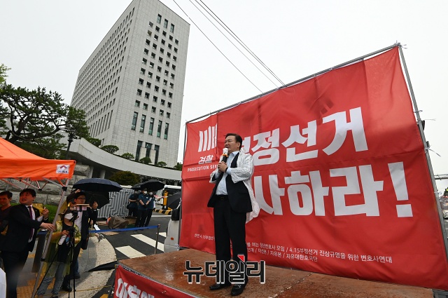 민경욱 전 의원이 10일 오후 서울 서초구 대검찰청 앞에서 열린 부정선거 수사촉구 집회에서 발언하고 있다. 민 전 의원은 "이번 4.15총선에서 부정선거의 증거는 넘쳐난다"며 "검찰의 엄중하고 빠른 수사를 촉구한다"고 밝혔다.