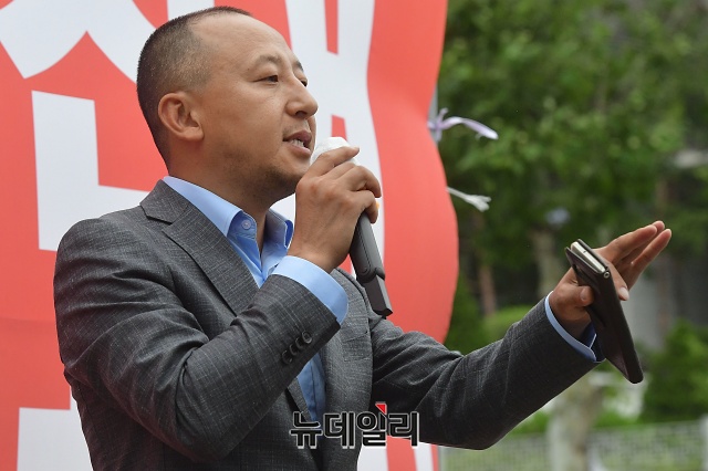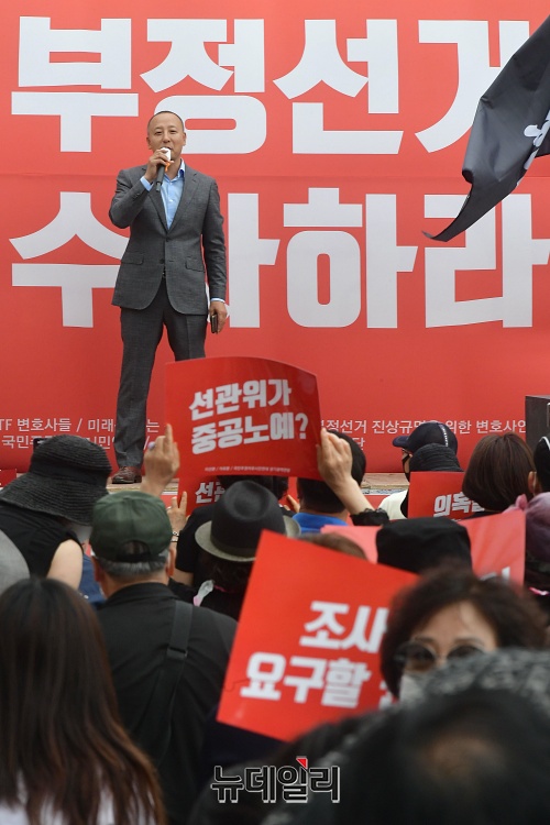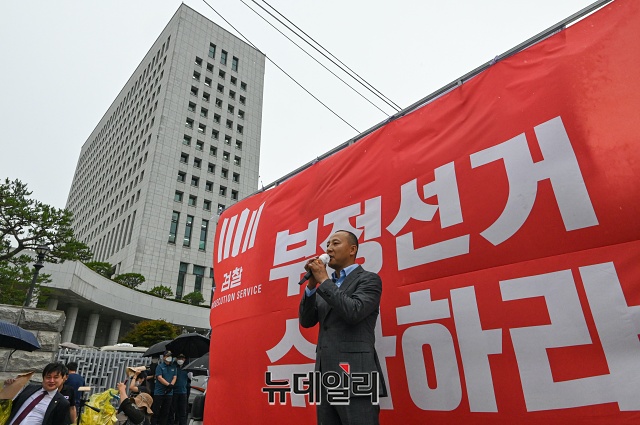 오상종 자유대한호국단 대표가 10일 오후 서울 서초구 대검찰청 앞에서 열린 부정선거 수사촉구 집회에서 발언하고 있다. 집회 참가자들은 집회 도중 비가 내리자 우산과 우비를 쓰고 수사 촉구를 주장했다.