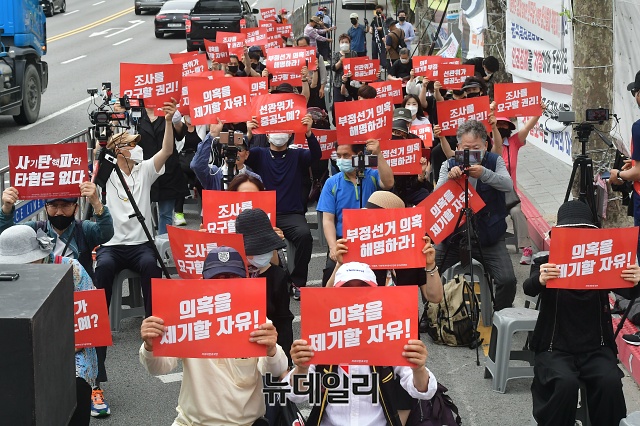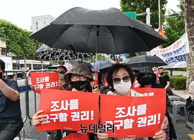 자유대한호국단 집회 참석자들이 10일 오후 서울 서초구 대검찰청 앞에서 열린 부정선거 수사촉구 집회에서 구호를 외치고 있다. 집회 참가자들은 집회 도중 비가 내리자 우산과 우비를 쓰고 수사 촉구를 주장했다.