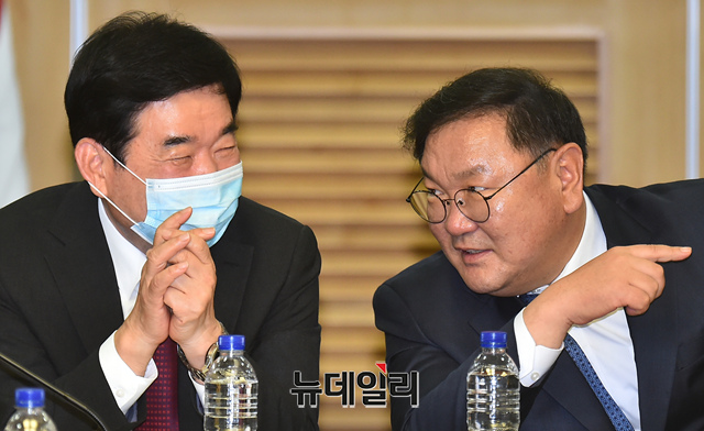 김태년 더불어민주당 의원이 11일 오전 국회 의원회관에서 열린 기업주도 벤처 캐피탈 CVC 활성화 토론회에 참석해 김진표 의원과 대화를 나누고 있다.