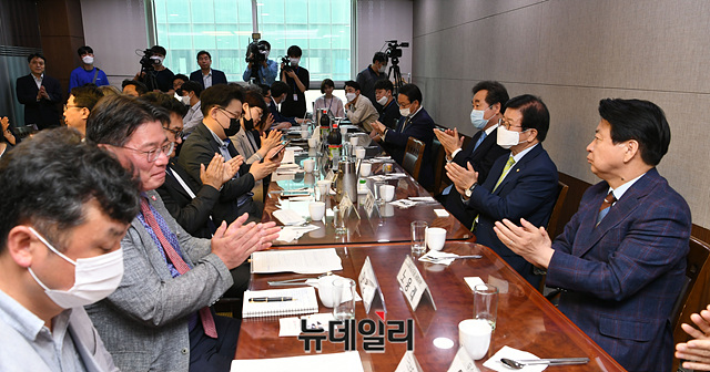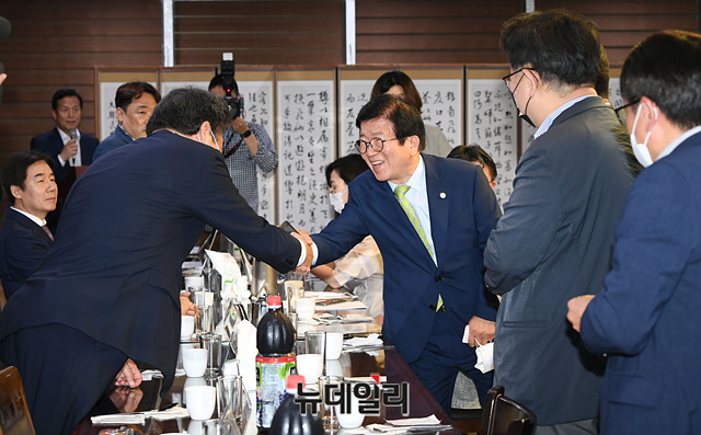 박병석 국회의장과 이낙연 더불어민주당 의원이 11일 오전 국회 의원회관에서 열린 '언론인 출신 제21대 국회의원-한국기자협회 임원진 간담회'에 참석해 악수를 나누고 있다.