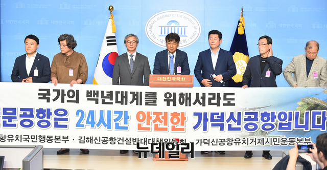 가덕도신공항유치국민행동본부 회원들이 11일 국회 소통관에서 부산지역 여야 국회의원 18명에 대한 동남권관문공항 설문조사 결과발표 기자회견을 하고 있다.