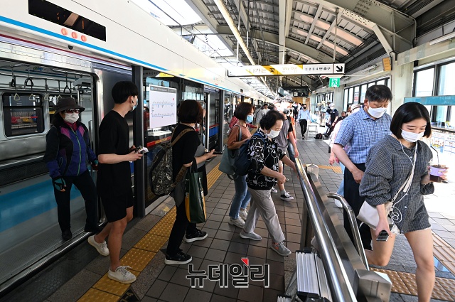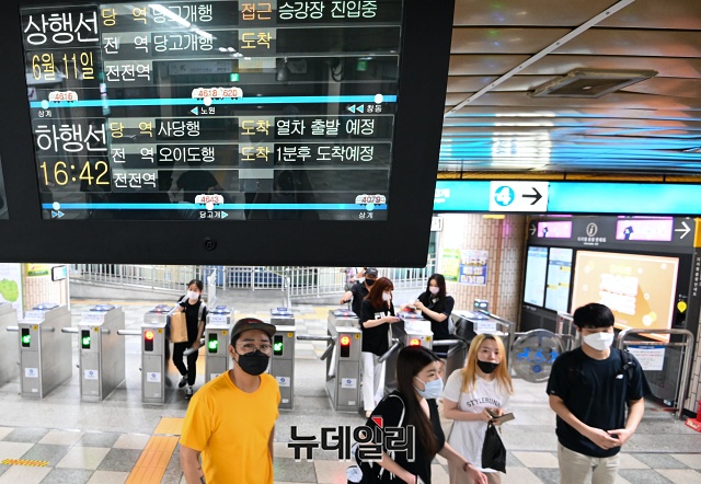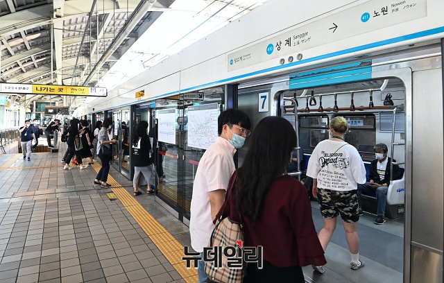 상계역을 이용하는 시민들이 11일 오후 서울 노원구 상계역에서 정상 재개된 열차에 탑승하고 있다.