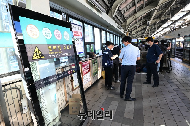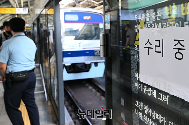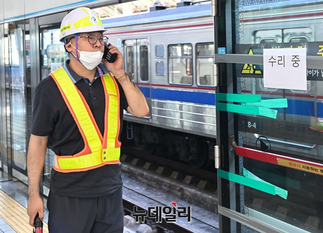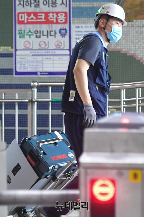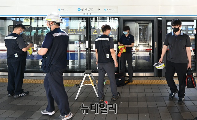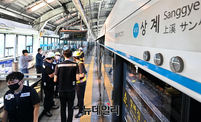 서울교통공사 관계자들이 11일 오후 서울 노원구 상계역에서 오전에 발생한 열차 추돌사고 복구를 완료하고 철수하고 있다.