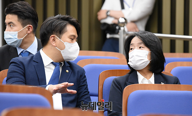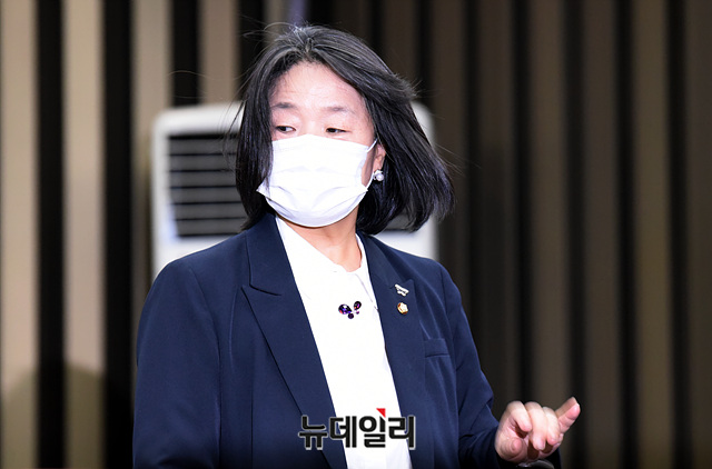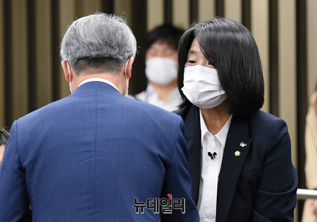 윤미향 더불어민주당 의원이 12일 오후 국회에서 열린 의원총회에 참석해 자리하고 있다.