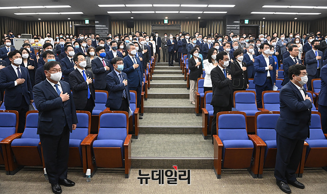 김태년 더불어민주당 원내대표 등 의원들이 12일 오후 국회에서 열린 의원총회에서 참석해 국민의례를 하고 있다.