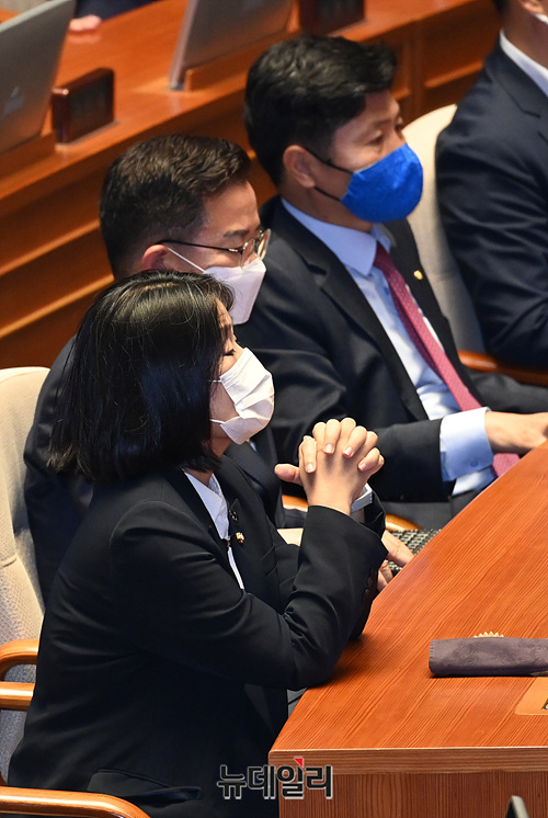 윤미향 더불어민주당 의원이 12일 오후 국회 본회의장에서 열린 제379회 국회(임시회) 제4차 본회의에 참석해 얼굴을 만지고 있다.
