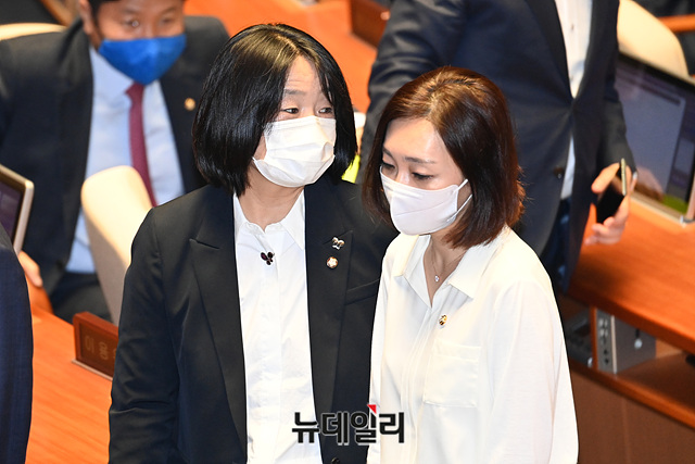 더불어민주당 의원들이 12일 오후 국회 본회의장에서 열린 제379회 국회(임시회) 제4차 본회의가 끝난 뒤 자리를 나서고 있다.