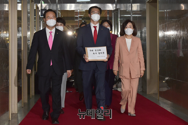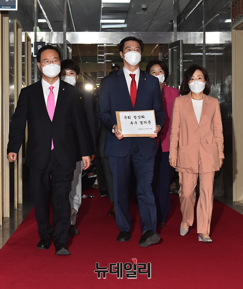 미래통합당 초선의원들이 15일 오전 국회에서 국회 정상화 촉구를 위해 의장실을 항의방문하고 있다. 이날 더불어민주당은 원 구성을 위한 행동 돌입을 예고했다.