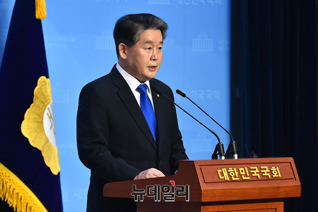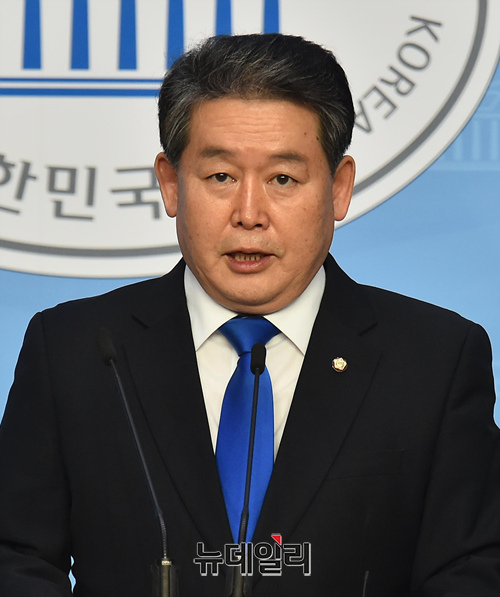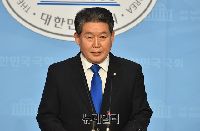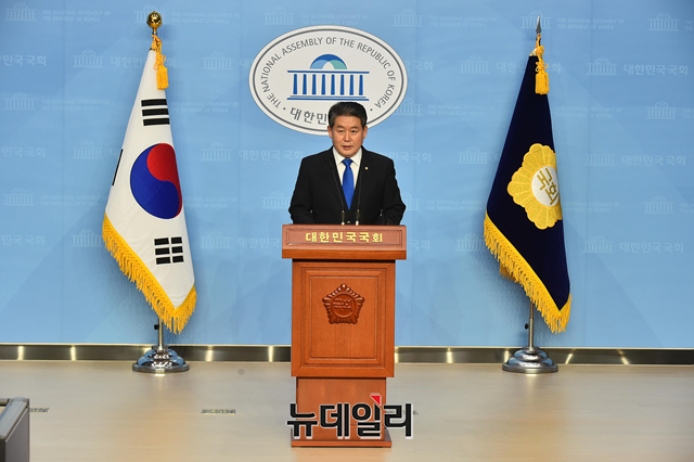 김경협 더불어민주당 의원이 15일 오전 국회 소통관에서 기자회견을 열고 한반도 종전선언 촉구 결의안 발의 이유를 설명하고 있다. 이 법안은 더불어민주당 소속 의원 등 범여권 의원 173명이 공동발의 했다.