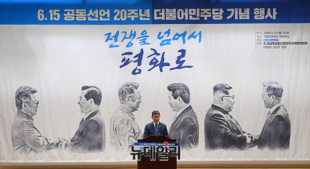 김연철 통일부 장관이 15일 오전 국회 의원회관에서 열린 6.15 공동선언 20주년 더불어민주당 기념행사에서 축사를 하고 있다.