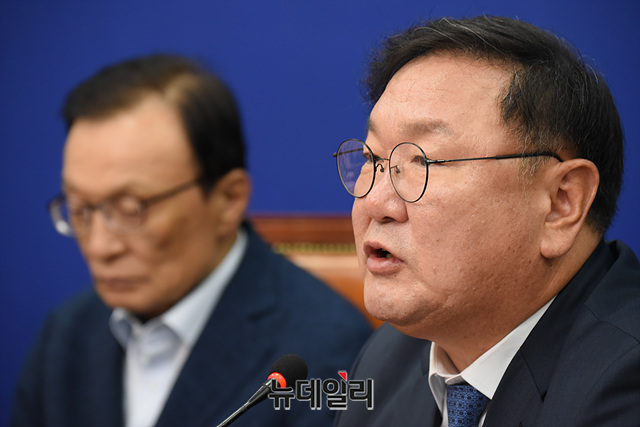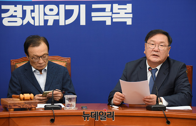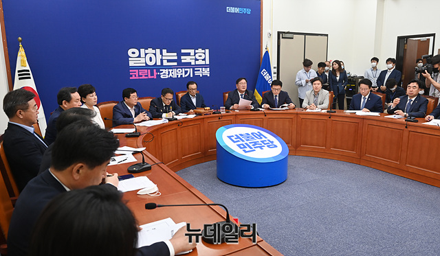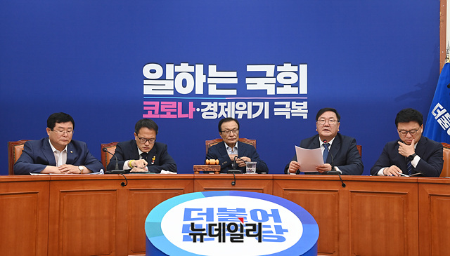 김태년 더불어민주당 원내대표가 15일 오전 국회에서 열린 최고위원회의에서 모두발언을 하고 있다.