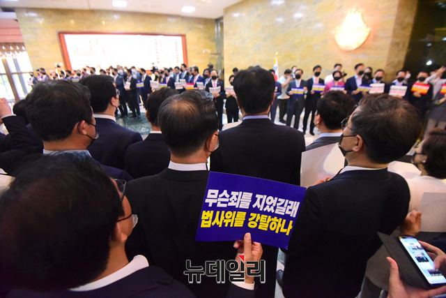 상임위원장 선출을 위한 본회의가 열린 15일 오후 미래통합당 의원들이 본회의장 앞에서 더불어민주당을 규탄하는 구호를 외치고 있다. 이날 더불어민주당은 법제사법위원회 등 6개 상임위원장을 제1야당 동의 없이 독단으로 선출할 예정이다.