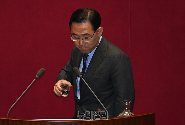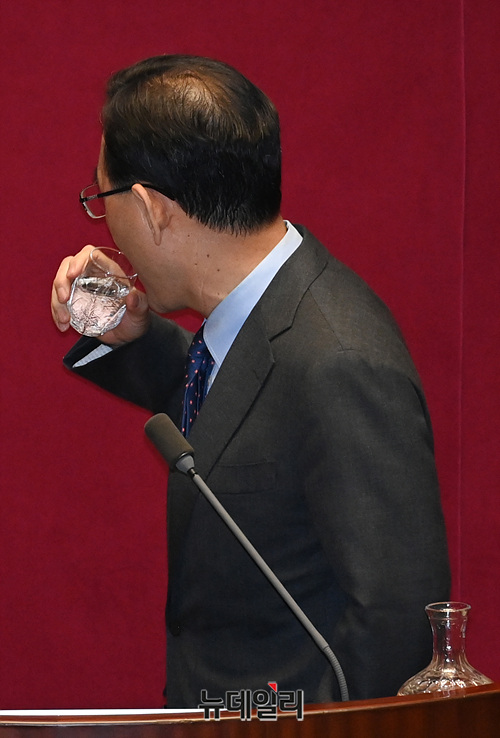주호영 미래통합당 원내대표가 15일 오후 국회 본회의장에서 열린 제379회 국회(임시회) 제5차 본회의에서 의사진행 발언에 앞서 물을 마시고 있다.