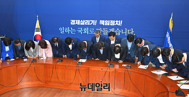 김태년 더불어민주당 원내대표와 윤호중 법사위원장 등 참석자들이 16일 오전 국회에서 열린 민주당 상임위원장-간사내정자 연석회의에서 기념촬영을 하고 있다.
