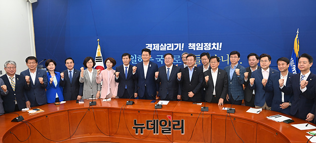 [포토] 기념촬영하는 민주당 상임위원장-간사내정자