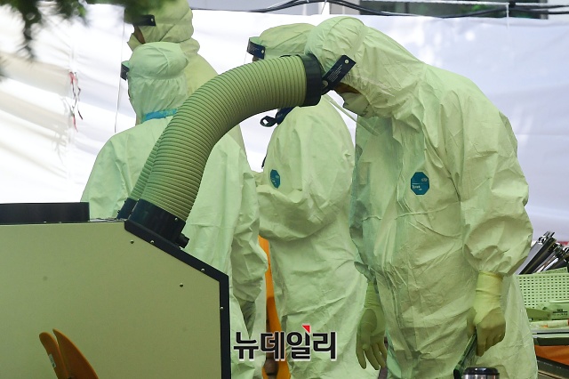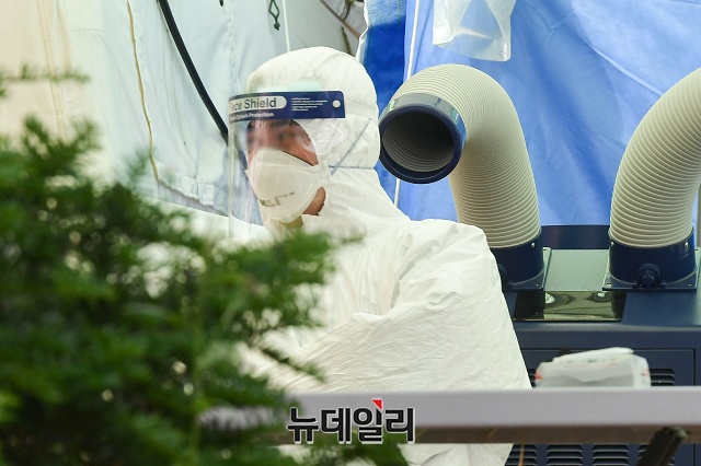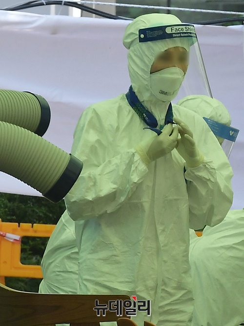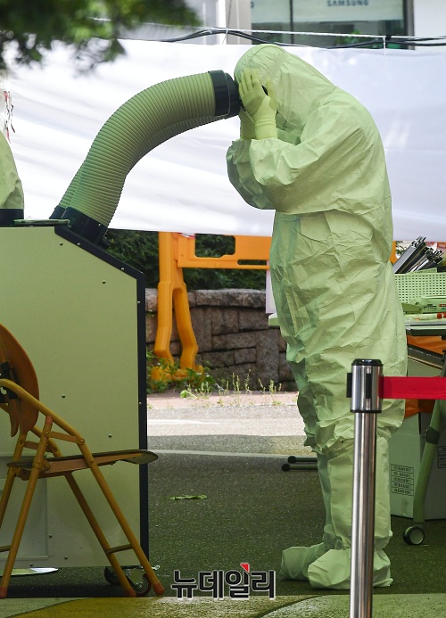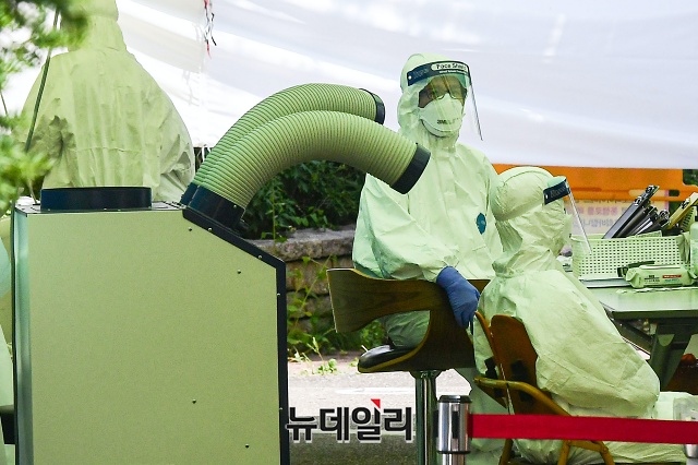 방호복을 입은 의료진이 16일 오후 서울 강서구 선별진료소에서 냉방기 바람을 쐬고 있다. 기상청은 오늘 서울지역 낮 최고기온이 30도까지 오른다고 보고 이번주 후반으로 갈수록 더워질것이라 예측했다.