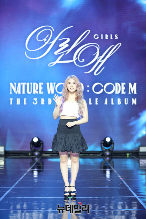 걸그룹 NATURE(네이처) 하루가 17일 오후 온라인으로 진행된 3번째 싱글앨범 'NATURE WORLD: CODE M(네이처 월드: 코드 엠)' 쇼케이스에서 포토타임을 갖고 있다.이번 앨범 'NATURE WORLD: CODE M'은 지난해 11월 발매한 'NATURE WORLD: CODE A(네이처 월드: 코드 에이)'와 이어지는 'NATURE WORLD' 프로젝트의 두 번째 앨범이다.강렬하고 중독성 있는 신스테마와 트로피칼 비트의 타이틀곡 '어린애(Girls)'를 비롯해 3곡을 담았다. (사진=n.cH엔터테인먼트)