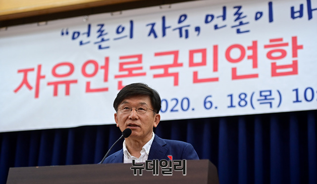 이준용 자유언론국민연합(자언련) 공동대표가 18일 오전 국회 의원회관에서 열린 창립식에서 인사말을 하고 있다.