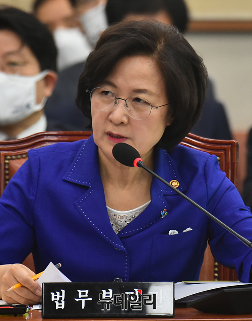 추미애 법무부 장관이 18일 오전 국회에서 열린 법제사법위원회 전체회의에 출석해 의원들의 질문에 답하고 있다.