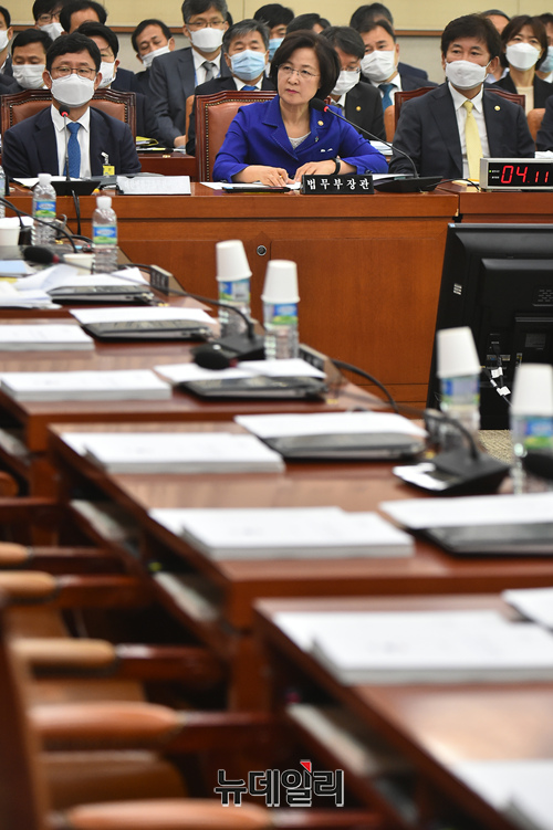 추미애 법무부 장관이 18일 오전 국회에서 열린 법제사법위원회 전체회의에 출석해 의원 질문에 답하고 있다.