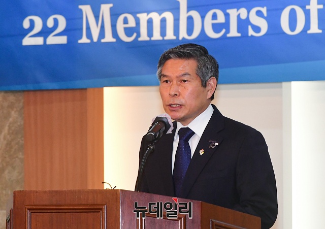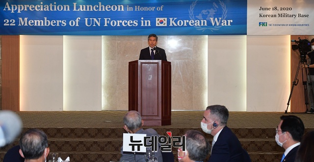 정경두 국방부 장관이 18일 오전 서울 용산구 육군회관에서 열린 '6.25전쟁 70주년 참전국 대사 초청행사'에서 인사말을 하고 있다.