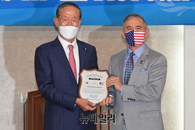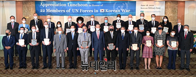 허창수 전경련 회장, 해리 해리스 주한미국대사를 비롯한 참석자들이 18일 오전 서울 용산구 육군회관에서 열린 '6.25전쟁 70주년 참전국 대사 초청행사'에서 감사패를 받고 기념촬영을 하고 있다.