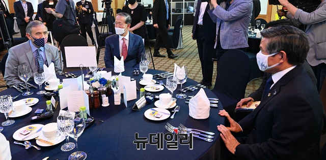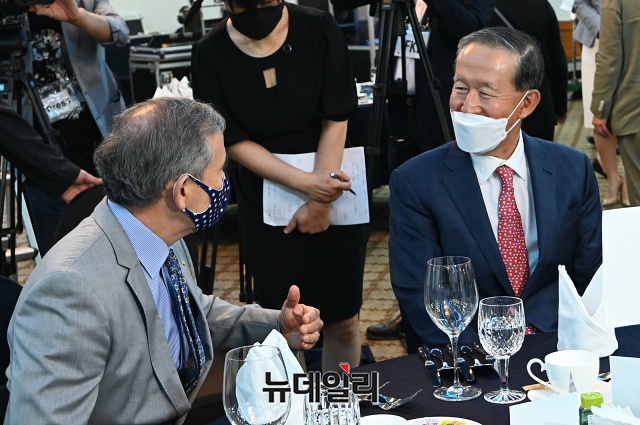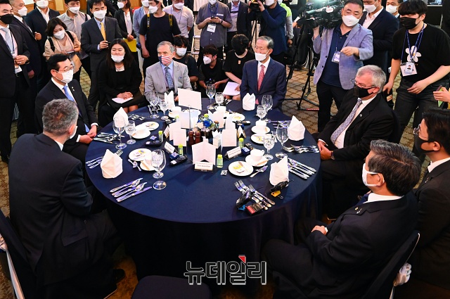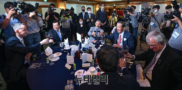 허창수 전경련 회장, 정경두 국방부 장관, 해리 해리스 주한미국대사를 비롯한 6.25 참전국 대사들이 18일 오전 서울 용산구 육군회관에서 열린 '6.25전쟁 70주년 참전국 대사 초청행사'에서 건배를 하고 있다.이번 행사는 전경련이 한국전쟁 70주년을 맞아 유엔군 참전 22개국 대사관들을 초청해 마련됐다.행사에는 허창수 전경련 회장, 정경두 국방부장관, 민홍철 국회 국방위원장, 해리 해리스 주한미국대사를 비롯한 참전 22개국 대사관들이 참석했다.