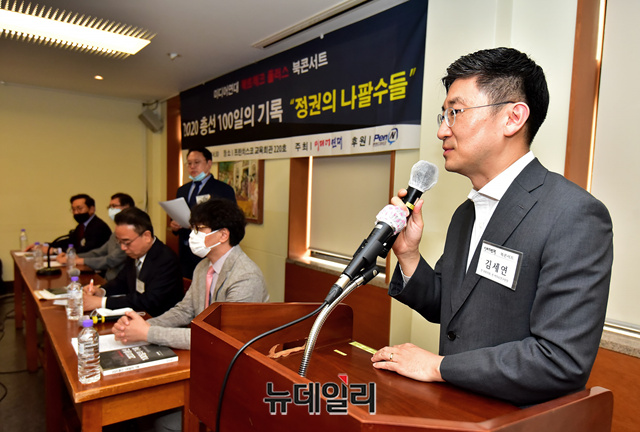 김세연 전 여의도연구원장이 18일 오후 서울 중구 프란치스코회관에서 '2020 총선 100일의 기록 "정권의 나팔수"'를 주제로 열린 미디어연대 북콘서트에서 축사를 하고 있다.