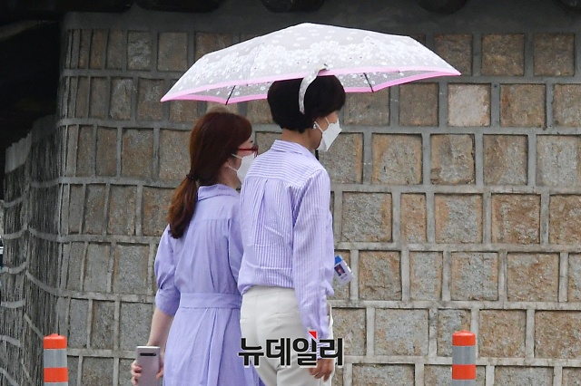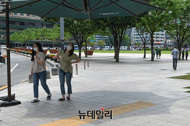 점심시간을 맞아 나온 직장인들이 19일 오후 서울 중구 시울시청 인근 그늘막에서 더위를 피하고 있다.